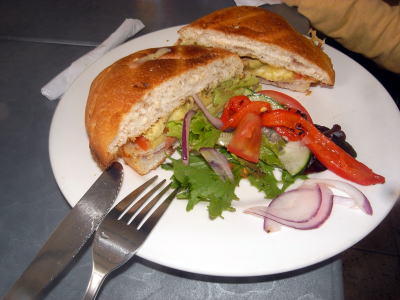 | パンもビック! フォークとナイフで頂きます。 半分でおなかいっぱい。 もう半分はお昼用にテイクアウトしました。 |