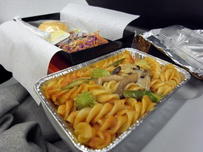 | それでも今回はありました 機内食。 パスタ、鳥丼、カツどん、帰りはカレーがあったかな。 |