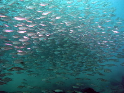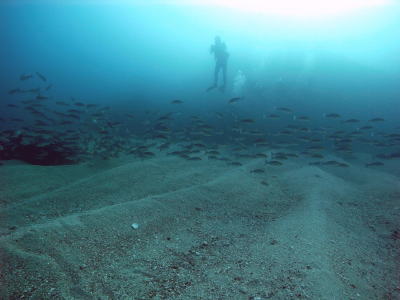 | 期間限定 アンドの鼻にも潜りました! 日に日に増えていくクロホシイシモチの群れは 圧巻の景色でしたよ♪ 最後は皆で群れの中に入ってしまいました! |