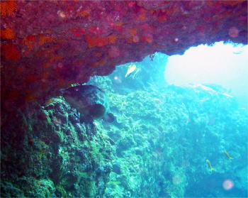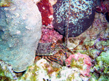 | 石とサンゴの隙間には、 大きなイセエビが隠れていました! 立派なひげが生えています! |