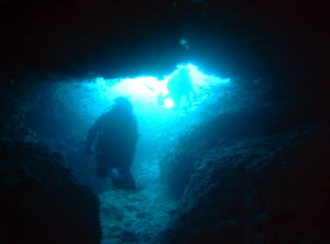| そして、『マッチ』ポイント♪ 大きな洞窟があって、中にはハタンポが群れ群れでした〜!! ハタンポをかき分けながら、光の方へo(^o^)o 沖縄気分も味わってしまいました! |