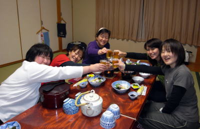 | 温泉にも入って、お腹ぺこぺこで乾杯☆☆ ご飯をいただいた後は、 レディースツアーのときにしか出来ないような レディーストークが炸裂o(^o^)o メンズの方には内緒です♪ |