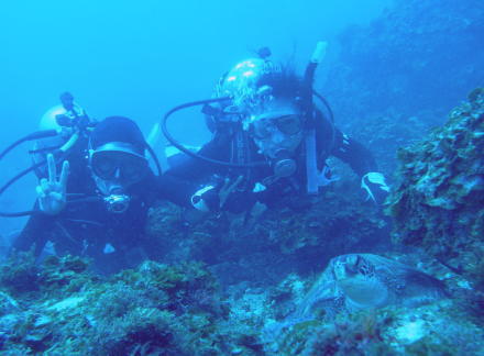 | なんとアオウミガメのお子様に大接近♪ ぜーんぜん逃げずに、私達の前で のほほーんとしてくれていました! Aさん、初カメよかったですね(^o^) |