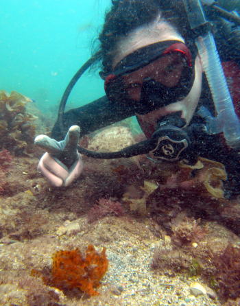 | 講習終了後、ウネリのある海に初のファンダイビングへ〜〜 すると、昨日『へんないきのもの』の本でチェックした カエルアンコウを自分で発見しちゃいました(o^_^o) エスカ振りまくリで、私達も大興奮♪♪ |