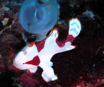白赤のくっきりとした、可愛らしい クマドリカエルアンコウ。 隣のホヤに寄り添っていました。 |