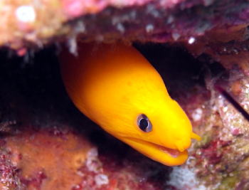 | ラストは幸せになれる 黄金色のゴールデンイールモレイ この子も、こう見えて 手の指ほどの太さしかない ちびっ子ちゃんです。 |