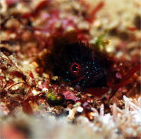 出雲ビーチのコケギンポの所長さんです!! 出雲ビーチにも、コケギンポ集合住宅があったんです☆ 同じ岩に仲良く4匹が同居♪ この集合住宅を発見者Nさんのお名前をいただいて 『☆☆の根』と名づけましたよ〜! |