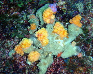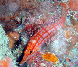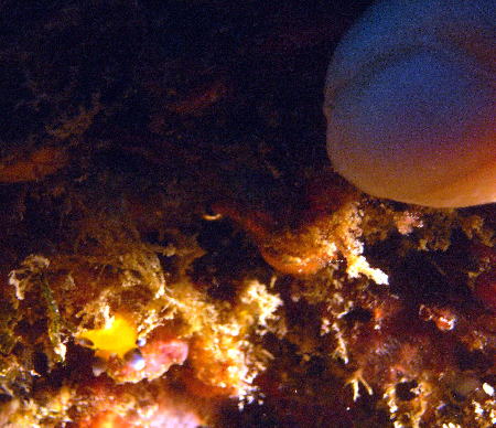 | こちらは、ベニカエルアンコウ♪ 真ん中に赤い斑点がくっきり(o^_^o) お腹がパンパンのまま、逆さま向いています!! 視線の先には、アオウミウシがっ・・・ まさか・・・ね(*^_^*) |