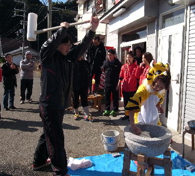 | ダイビングの合間にはお餅つきですヾ(^▽^)ノ みなさんのパワフルな杵つかいで、 モッチモチのお餅が出来上がりましたよ〜〜♪ つきたてのお餅を、みんなでお腹いっぱいになるまで いただきました(o^_^o) |