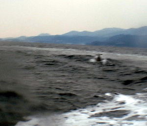| 注目!!! 出ましたよ〜イルカがっ!!!! 船の上から、イルカちゃんを発見ヾ(^▽^)ノ おいで♪おいで♪イルカ〜♪と口ずさむと ほんとに、船の近くまでやってきたんですぅ〜〜!! 右のほうにでっぱっているのがしっぽですよ☆ |
