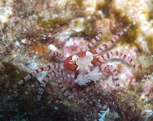 新年会ツアーに参加された皆さんに 『今年もいっぱい潜るんやで〜(^‐^)』と エールを送っているように、ポンポンをふ〜りふりしていた キンチャクガニです♪ |
