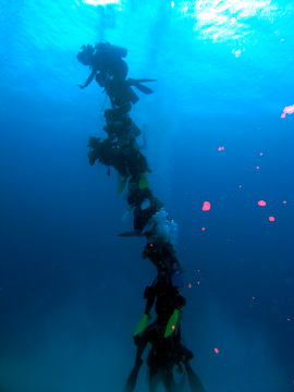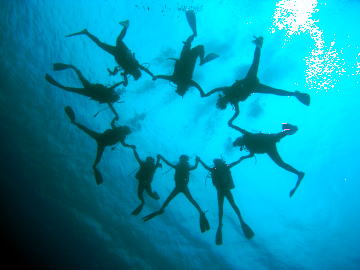 | トーテンポール完成の後は、 水中で輪っか作りに挑戦です!! 上手にできてますね〜(o^_^o) さすがお上手カーンダイバーです♪ |