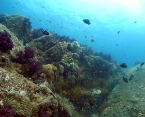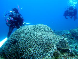 こちらはママさんダイバーとしてダイビング復活のKさん! 大きなハナガタサンゴを前にうっとりです♪ 久しぶりに見たら、更に大きく見えたのでは?? |