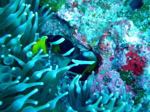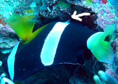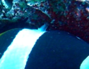 クマノミの、まさに産卵の瞬間ですっ!!! ママが頑張っって卵を産みつけた後は、 パパに交代! 元気な赤ちゃんが生まれてくるために パパも頑張ります! 産卵もパパとママ両方の愛情が必要ですからね〜♪ |