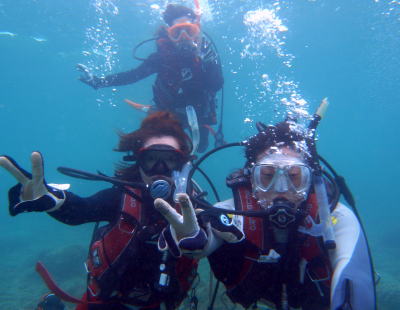 ドッキドキだった水中も 講習をこなしていくうちに こんな感じで余裕のピースサインも出るように なってきました〜!ヾ(^▽^)ノ |