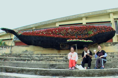 | 親子クジラもGETして、お花が咲いたクジラの前で 座間味の海を眺めながらのランチ♪ お天気もよくなって来ましたよ〜 |