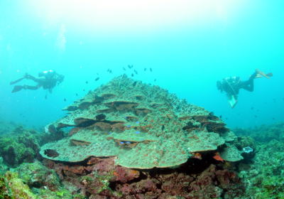 ワイド感たっぷりのハマサンゴ♪ そのハマサンゴの周りに二人のダイバー!! 素敵ですね(^o^) |