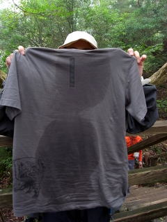これは縄文杉に到着した時にTシャツ こーんなに汗だくになっちゃってます!! 気温は涼しいんですが 歩き続けていると いーっぱい汗をかきます。 帰りは、縄文杉のすぐ横から湧いているお水をくんで グビっと飲むと、美味しいんですよ! |