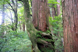 | こちらは夫婦杉(o^_^o) 夫(右)の杉と、 妻(左)の杉が 仲良く手をつないで成長を続けています! うらやましい?! |
