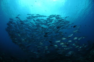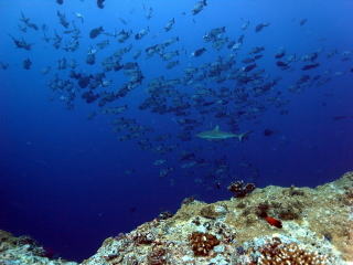 ![]() マダラタルミの大群に グレイリーフシャークも飛び込んでいます! |