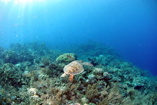 ![]() 光のふりそそぐ草原を泳ぐウミガメが素敵です♪ |