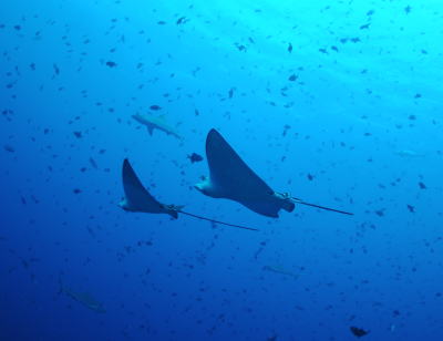 | ブルーコーナーの守り神 可愛いちびっこマダラトビエイです! 向こうにはグレイリーフシャークも泳いでいますね♪ |