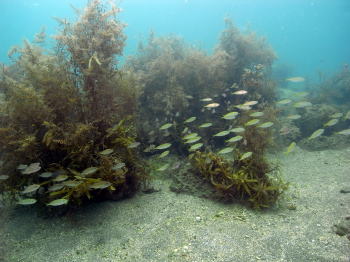 透明度も良く快適にダイビング♪ 日本海らしいホンダワラたちに アジの子供たちがわ〜い! |