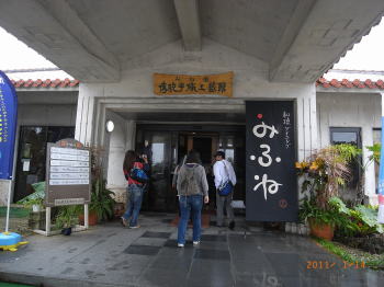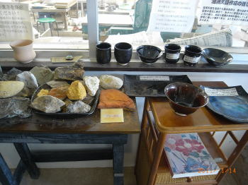 続いて石垣焼きの窯元へ。 ここは入り口。このような石が原材料になります。 石垣の海のようなブルーが出るガラスと 陶器用の土の焼け具合冷え具合が違うため とても難しいのだそうです。なんと100万円のお皿も置いてありました! 皇室からもご見学に来られたそうですよ。 |