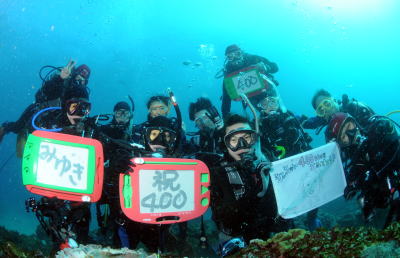 | 年末年始初の 沖縄 久米島へ行ってきました〜! 日本列島全域を覆うほどの大寒波のため、久米島も、海は大荒れ&陸も寒空の中でのダイビングスタートになりましたが、日を追うごとに徐々に落ち着きを取り戻し、青くて穏やかな海になってくれました! 到着日は、すでに風が強まってきており、翌日はこの冬一番の大荒れになりそう気配…ということで、早速、親子岩まで遠征してきました!エントリーすると、青くて明るい海が私たちを出迎えてくれました!この日は、Sさんのバースデー♪ということで、記念撮影をして、早速水中散歩にお出かけです! 沖縄でしか出会えないハナビラクマノミや、セジロクマノミ、ハマクマノミにご挨拶!もちろんグルクンや、この秋に生まれたばかりのデバスズメダイのちびっ子たちも、サンゴの間を元気に泳ぎまわっています! 最後には、イワシ群れがビューンとやってきて、そこへイソマグロのお子様も登場♪マダラトビエイもでましたが、気配くらいしか見えなかったです(>_<) この日はこの1ダイブで終了!ダイビングの後は、ゆっくりお風呂に入って、夕食は居酒屋でおいしいご飯をいただいて、この日は朝も早かったので、早めに休みました! 翌日は、部屋にいても聞こえるくらいの風の音、窓の外をみると白波がザップーン…はて、今日は潜れるのかな?と不安になりつつ、サービスのガイドさんと相談。なんとかインリーフのポイントなら行けるかな?ということで、とりあえず1ダイブ行ってみよう、ということになりました。なんとそのダイビングがKさんの100本記念ダイブ♪透明度は期待できないけど、とりあえずせっかく来たし、どこでも潜れるところで、とナンクチモドキ、というポイントへ! ほかに潜れる場所がないので、他の船もとまっています。水面からは、それなりに根が見えている感じ。いざ、Kさん100回目のエントリー!そこは白い砂地のため、少し巻き上がって白っぽくはなっていますが、ぜんぜん見えてるやんっ!少し移動した根のところには、ハダカハオコゼのペアがいたり、カクレクマノミとナデシコカクレエビが住んでいるイソギンギャク、どこからともなく運ばれてきた?コクテンフグちゃんと遊んだら、100本記念のお祝いです(^-^)v記念撮影をしたら、水中胴上げ&お友達からのお祝いイルカちゃんもかけつけてくれましたね♪そして、Kさんのコメントは「試練多すぎ」でした(>_<) OW取得後、なぜか荒れた海が多かったKさん、まさか久米島にまで試練があるなんてっ。でも、きっと試練の後には、素敵な素敵な世界がたっくさん待ってますからね〜!これからも乗り越えながら、楽しんで潜っていきましょうねっ!! さて、普段串本の海で鍛えに鍛えた皆様にとっては、大した荒れではないな、ということで、昼食をはさんでもう1ダイブすることになりました!お昼は年越し沖縄ソバをいただきましたよ! この日の2本目、2010年潜り納めは「イソバナポイント」です!インリーフなので、透明度はいまひとつですが、びっしり広がるサンゴにヨスジフエダイやノコギリダイが群れていたり、離れ根には、スカシテンジクダイ&キンメモドキがいっぱいで、沖縄感が漂っていました!のんびりまったりと潜り納めを満喫しましたよ(^_-) 最高気温10度…な沖縄ダイビングのあとは、ひとまずやっぱりお風呂につかって、あったまり、夜は居酒屋で飲んで、食べて、そして、お部屋で写真上映会、紅白歌合戦、カウントダウンへ、と進んでいきましたよ!なにか話をしていたら、気がつけば2011年になっていて、慌ててしまいました(@_@) 日が変わって2011年になったので、皆さん、それぞれに今年の抱負もいただきました!それぞれの目標にむかって、楽しく毎日過ごして、潜って、してくださいね〜♪ 翌日は、若干ではありますが、海も穏やかになってきました。少し外海にも出て行けそうな気配?!様子をみながら、トリノクチまで行きました!初潜りは、青い海に、グルクンいっぱいの海で、スタートです!まずは記念撮影をして、串本の赤鯱神社から取り寄せた?大明神のお札をお配りしましたよ!ここは地形も面白いところで、水中トンネルをグルグルとくぐって、地形を堪能しました♪ 一旦、港に戻って休憩したら、2本目は、2010年夏に発見された一大サンゴの群生を見に行きました!ナンハナリというポイントで、ヤセミドリイシサンゴが幅200m以上、長さ2km以上に及ぶとも言われていて、まだ調査途中なのですが、最近ダイビングポイントになったばかりといことで、カーンツアーでも初のエントリーです!エントリーして、少し泳ぐと…本当に見渡す限りのサンゴ・サンゴ・サンゴヾ(^▽^)/ どこまで泳いでもそのサンゴが続いています!そして、泳いでいる途中で、なんともいえない音が聞こえてきました。ひょっとして…と思ったら、やっぱりそうでした〜っ!!ザトウクジラのラブソングですぅ(^o^) なんどもなんども聞こえてくるクジラの歌声に、聞きほれ、目の前に広がるサンゴに見惚
