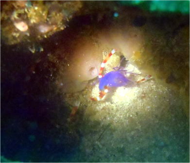 | ムラサキボディがお洒落な バイオレットボクサーシュリンプは ペアで仲良し。 メスは卵たっぷりで スポットライトを浴びていました♪ |