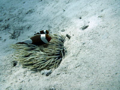 座間味に隠れたトウアカポイントがっ! トウアカさんがいつも住んでいるのとは違う イソギンチャクにしっかり住み着いていましたよ〜(^-^) 真っ赤な卵を大切に守っていました! |
