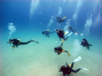 | さあ!ダイビングスタートです!!! ガイドさんの姿、よーく覚えてくださいね〜 一番、なが〜い方です(^_-)-☆ |