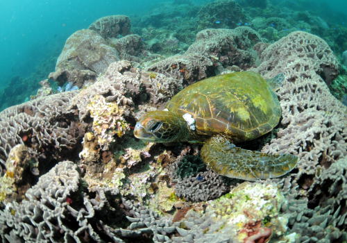 前日にイルカが現れたというグラスワールド! 迎えてくれたのは のんびり龍宮城まで連れて行ってくれそうな アオウミガメさんでした♪ |