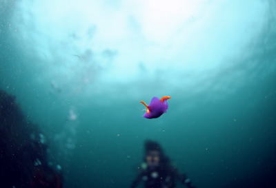 | イルカを求めてエントリーした水中では マクロのオンパレード!! でも、Sさんのカメラはイルカ狙いでワイドレンズ・・・(笑) それでも、小さなムラサキウミコチョウも完璧に捕らえてます!! さすがフォトコン受賞者っ!! |