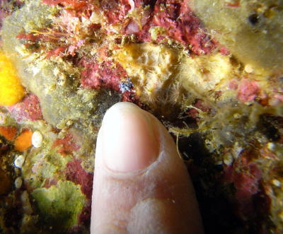 | 指の先よりはるかに小さなウミウシ・・・。 肉眼では判別不能!! Sさんも、思わず『マクロレンズーーー!!!!』と絶叫(@_@) |