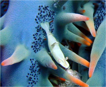 | ヒトデヤドリエビをゲット! ドアップです。 とげとげはオニヒトデ。 刺されないか ひやひや。 |