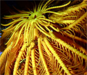 黄色いウミシダの裏を見ると。。。。 わ!コマチコシオリエビがいっぱい! バサラカクレエビがいて、その子を見ていたのですが うじゃうじゃコマチコシオリエビがいるのに びっくりしちゃいましたね。 |