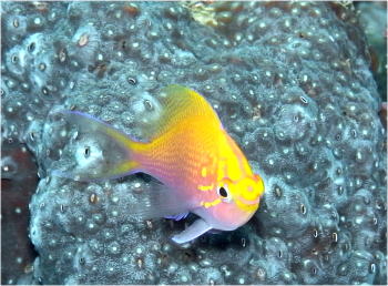 これまたスリバチカイメンの隙間で ちょっぴり見づらい 青いカニダマシ。 色がほんときれいです! |