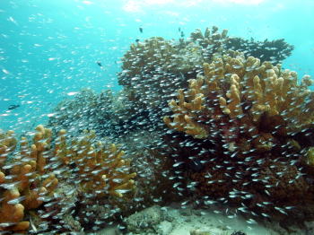 | あちらこちらにサンゴの根と スカシテンジクダイの群れ。 贅沢ですなあ〜 |