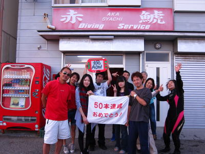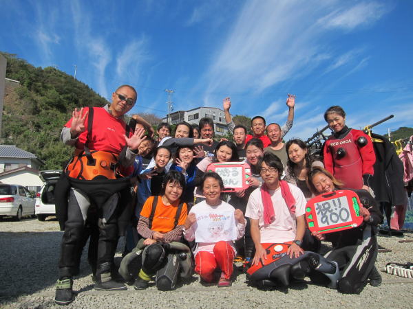 | Y田様の900本記念ツアーへ串本へ行ってきました〜っ!! 記念ダイブの土曜日は、快晴&海も最高のコンディション(*^。^*) 絶好の記念日和になりました! 土曜日は、まずは吉右衛門へ!大飛行隊チームで、透明度のいい中層を、南の離れ根まで大飛行!そして、シンデレラウミウシちゃんにも会いに行きました!すると…シンデレラが、産卵しています〜(*^_^*)おーっすごい!もうそんな季節なんですね♪ アンカー下の根には、なんと可愛いクロハコフグのお子様も登場してくれましたよ!イサキや、スズメダイも群れ群れの賑やかな海でした! そして、そして、Y田様の900本記念は・・・グラスワールドへっ!!ここも透明度抜群o(^o^)o 記念ダイブにふさわしい海が待っていてくれました!まずは、全員で記念撮影&もちろん水中胴上げです♪そして、Y田様900回目の水中ツアーを皆で楽しみに行きました!まずは、ハナヒゲウツボぉ、と思いきや、先週いた場所にはいない…グラスのクリスマスツリー コブハマサンゴには、カガミチョウチョウウオもかくれんぼしていました!その後、人気者のハタタテハゼ→アカヒメジの大群→ハナゴンベ→マルスズメダイの赤ちゃんと王道コースを楽しんで、アンカー下へ!すると・・・噂の、めっちゃちっこい、ほっそい、ハナヒゲウツボの赤ちゃんがニョキっと顔を出していました!こんなサイズは、私も初めて♪一同、釘付けになっちゃいました(*^。^*) しばらく居ついてくれるといいですねぇ! 三本目ももちろん行っちゃいます!10月いっぱいでクローズになってしまうアンドの鼻!浅場からエントリーすると、アンカー下には可愛いツバメウオの幼魚が4匹!人懐っこくて、ダイバーの周りをウロウロしてくれました!そして、珍しいソメワケヤッコの赤ちゃんもサンゴの隙間にカクレンボしていましたよ!葉っぱみたいにヒラヒラしているハダカハオコゼの赤ちゃんも、今シーズンのアンドの鼻のアイドルでしたね!最後は、元祖 アザハタの根を楽しんで、エキジットしました! ボートチームとは別でOW講習をしていたKさんも、無事にこの日のメニューを終えられました!あともうちょっと、がんばってくださいね〜♪ 夜は、今シーズン初のお鍋〜っ!今回は、ピリからキムチ鍋でした!ホルモンやら豚肉をたっぷりと投入〜o(^o^)oもちろんお野菜もたっぷりと♪そして、トリプル〆のスタート(^○^) まずは、うどん、そして、中華そば、そして、最後は、チーズ卵雑炊〜(^-^) これが最高に美味しかったですね♪ぜひ皆さんも、最後の雑炊にやってみてくださいね〜! お鍋が終わったら、ログハウスでログ付け&Y田様の900本記念式典(*^_^*)ケーキでお祝い&STAFFお手製のグッズをプレゼント〜〜〜♪「900本は、1000本への通過点」というY田様らしいお言葉を頂戴しました!来年の1000本記念は、これまでになく盛大なお祝いしましょうね〜(*^。^*)本当におめでとうございます!!! そして、日曜日!お天気は曇りがちでしたが、海は穏やかです!そして、透明度も抜群! まずは、「串本でまだカメ見たことない!」というIさん&Sくんのリクエストもあって、グラスワールドのカメコースへ行くことになりました!最近は、定位置にあまりおらず、ちょっと移動しているという噂・・・会えるかどうか、ドキドキしながら、カメコースへ向かいました!すると・・・いました〜っ!!!サンゴの上にちょこんと乗っかってくつろいでいます!全員が無事にウミガメさんと出会えました!よかった〜(^○^) そして、シコロサンゴの群生をみて、癒され、アンカー下へ戻ると・・・昨日も出会った超チビチビなハナヒゲウツボちゃん♪今日も元気に「シャーッ」」と威嚇しています!そこで、Y田様のステキな指示棒の登場♪先っちょに疑似餌みたいなのがついているので、それをハナヒゲちゃんの目の前でヒラヒラさせると…ニューッと全身出てきてしまうんじゃないか、というくらいに出てきてくれました!あまりに出てきてくれるので、全員でたっぷりハナヒゲちゃんと戯れることができましたね♪また遊んでね〜っo(^o^)o さぁ、ラストダイブです!最後は、イスズミ礁で水中散歩を楽しみました!ウミウシ銀座には、きれいなゾウゲイロウミウシのチビッコも登場♪そして、最近うろちょろしているクロハコフグのお子様にも出会えましたよ(*^_^*)サンゴの隙間を行ったり、来たリする姿が超キュートでしたね(^-^)しばらくいてくれるといいなぁ。最後は、砂地でフィンを脱いで、世界体操大会?!水中でなら、スゴ技だって決められるのです!ムーンサルトだってお手の物ですよ〜(^○^)ぜひ皆さんも、やってみてくださいね! OW講習のKさんも無事に全スキルを終えて、ダイバー認定です!おめでとうございます(^-^)1000本とは言わないので、まずは50本目指して、これからも頑張ってくださいね〜o(^o^)o 最後に、Y田様、900本達成、本当におめでとうございます♪来年の1000本記念が楽しみですね!まだまだこれからも宜しくお願いいたしますm(_ _)m そして、ご参加いただきました皆様