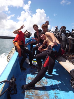 OW講習生の皆さんも 講習終了後、初のボートダイビングにも挑戦しましたよ! 海も穏やかで、 きれいでお魚いっぱいの海に 感動ひとしおの皆様でした! さぁ、これからもーっとすごい海 潜りにいきますよ〜っ!! |
