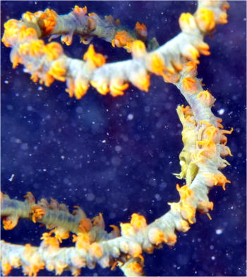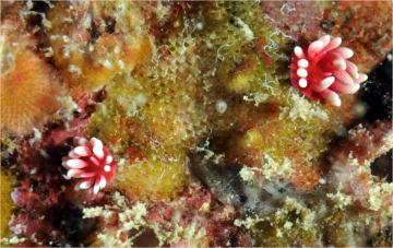 ちっさなヒロウミウシも! お花みたいですよね。 良く見ると、ちょっと異質な触角があるのが分かります。 2本の角が見えるのが前です。 |