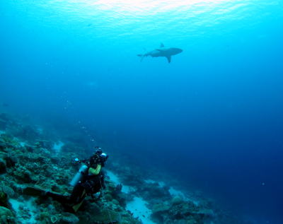 初日のウーロンチャネルでまずはサメウォッチング〜! 頭上を通り過ぎるサメを激写中のSさんです! |