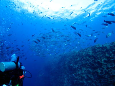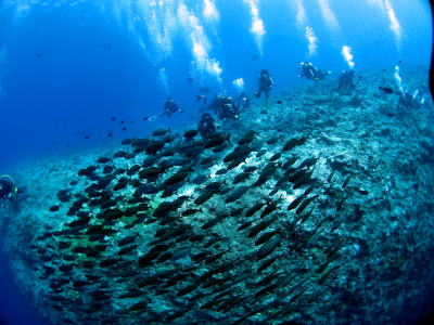 最終日は早朝集合でブルーコーナーへ! 1本目はなかなかいい感じの流れ♪ そこにはマダラタルミの群れに ギンガメアジの渦です! |