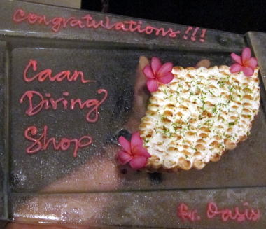 | 最後の晩餐は おしゃれなムード満点のエリライレストラン♪ 何を食べても美味しいよ〜(^-^) そして、真ん中にマンタの木彫りのストーリーボード お世話になったオアシスさんにいただきました! 有難うございました!! |