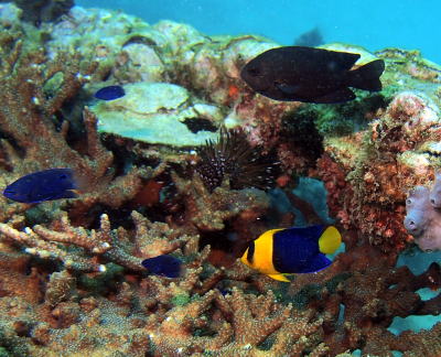 | ソメワケヤッコのちびっ子も スズメダイやチョウチョウウオを 追い払いながらサンゴの隙間を 陣取っていましたよ〜(^○^) |