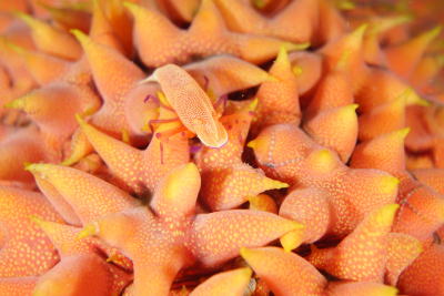 巨大なバイカナマコをはっけーん!!! と、思ったら、巨大なウミウシカクレエビが ペアでついていました〜(^-^) 越冬してくれるといいなぁ♪ |