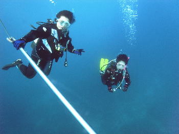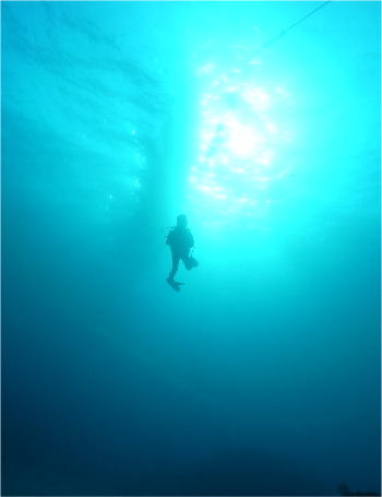 | こんな風に、水中から船長さんが見えちゃいます! 空も青くていい感じ〜♪ |