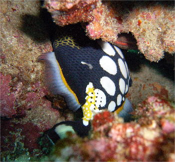 こちらもぶつかっちゃいそうになった イシガキフグ 正面顔がかわいいですね〜♪ 間違っても、口に指を突っ込んだりしたら ダメですよ〜 |