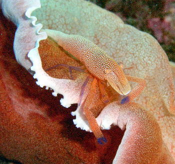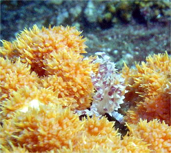 | 巨大なゴーヤほどもあるミカドウミウシにくっついていたのは これまた大きなウミウシカクレエビのペア。 |